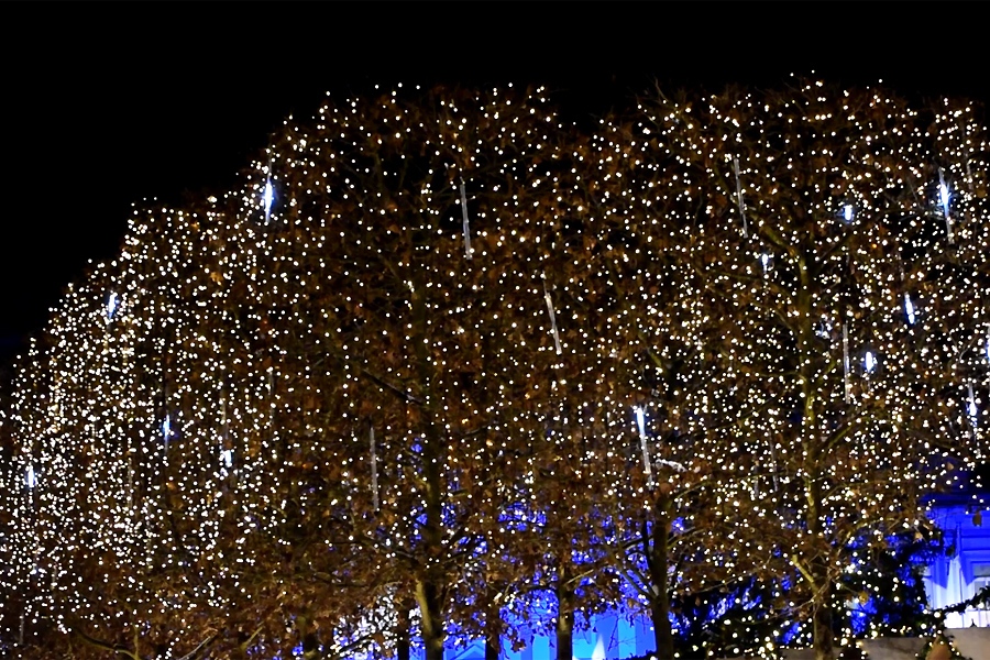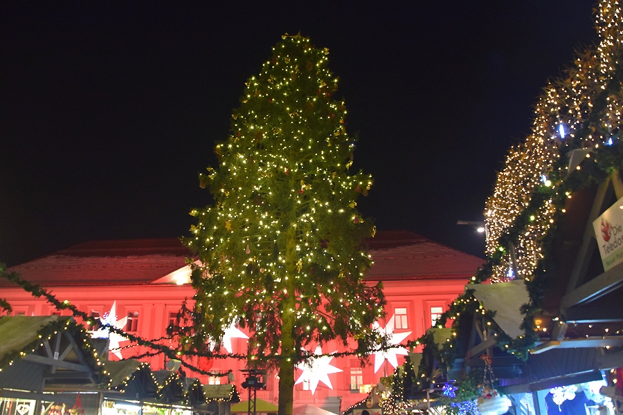 Immer auch ein Tipp für das Auge: Die schönen Häuser rund um den Neuen Platz wahrnehmen. Zusammen mit der großen Weihnachtsbeleuchtung auf den Bäumen ergibt das ein Fest für die Sinne.