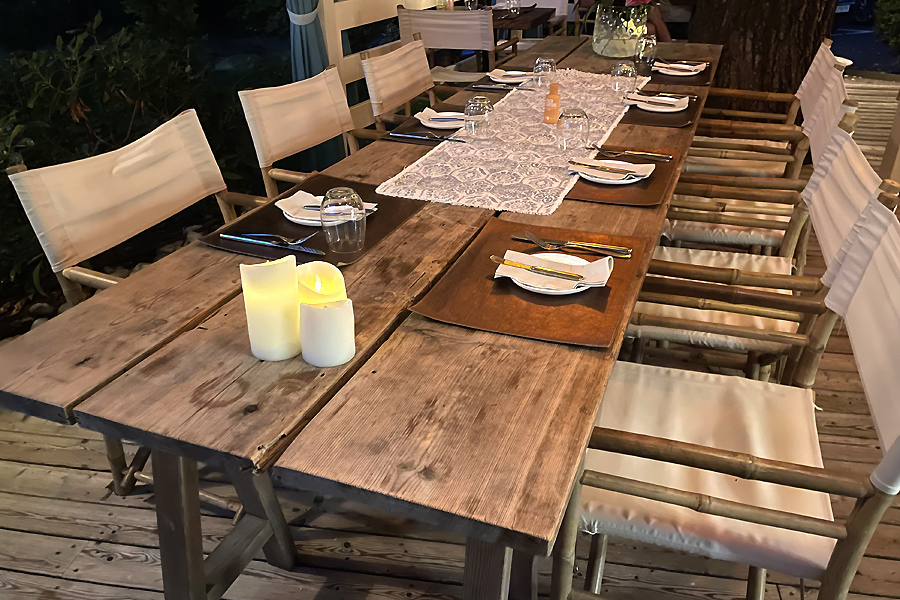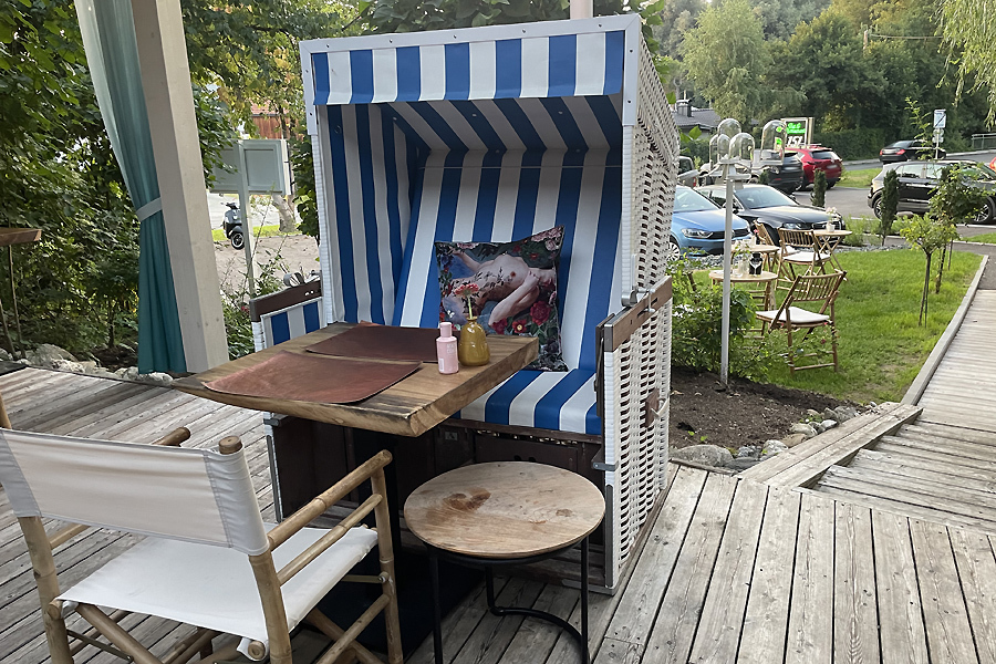 Perfekt für einen lauen Genuss-Sommerabend ist die Terrasse. Die Einrichtung ist ein gelungener Stilmix mit skandinavischem Flair, aber verspielter mit ein wenig Kitsch und ein bisschen Shabby Chic. Dazu passen der überdachte Strandstuhl und der große Luster beim Eingang. Das Licht macht sein Übriges.
