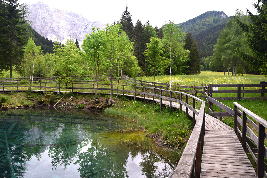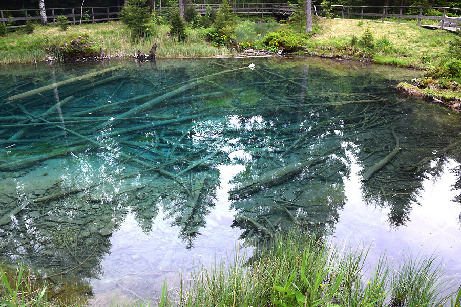 Die Farben sind wunderschön. Der Holzsteg führt rund um den Teich, der je nach Wolkenlage oder Sonneneinstrahlung ein mehr oder weniger intensives Türkis hat.