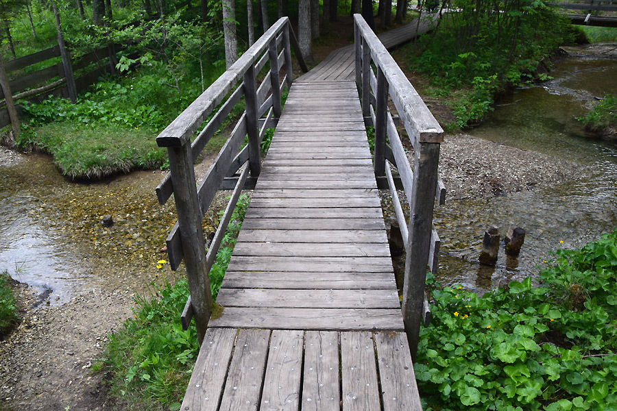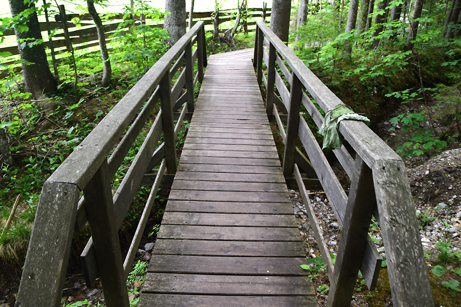 Wenige Gehminuten später ist der Eingang zum Meerauge erreicht. Ein bisschen mystisch mutet dieser Eingang, der sehr schön mit einer Holztafel gestaltet wurde, an. Man taucht in eine Art „Zauberwald“ ein, ein angelegter Holzsteg mit Brücken über den Bodenbach führt nun zum Ziel dieses Spazierganges.
