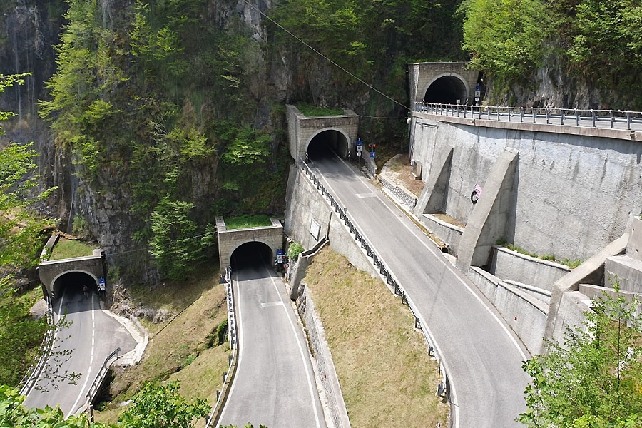 Heute wird der Verkehr per Ampeln geregelt. So eng ist die Durchfahrt der fünf Tunnels, die in den Berg gehaut werden mussten, um die Kehren bauen zu können. Die Geschwindigkeit ist auf 30 km/h reduziert. Mehrmals waren Busse in den Tunneln stecken geblieben, daher ist die Höhe auf 3,20 Meter beschränkt.