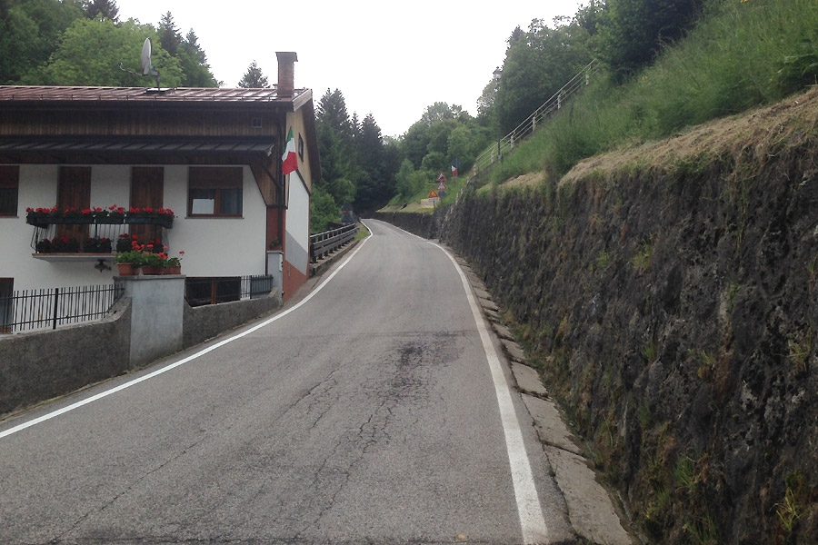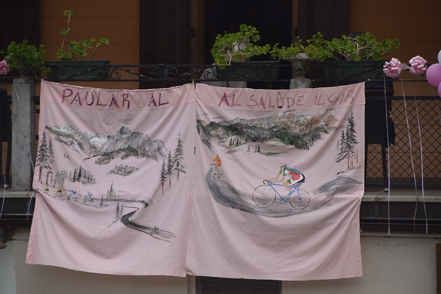 Stichwort „Passo Duron“: Genau dort hatten wir unseren Platz zum Mitfiebern auserkoren. Gleich ein paar Meter vom Ortskern in Paularo entfernt, beginnt die erste steile Rampe mit 18 % Steigung. Der Ort wurde von den Einwohnern wie üblich mit rosafarbenen Utensilien herausgeputzt. Schon bei der Anreise steigt dadurch die Vorfreude.Zunächst gilt es, die Stunden bis zur Ankunft des Trosses zu verbringen. Wenn der Giro kommt, ist allerhand los in so einem Dorf. Es liegt etwas Besonderes in der Luft. In der gemütlichen „Bar Italia“ vergeht die Zeit wie im Flug.