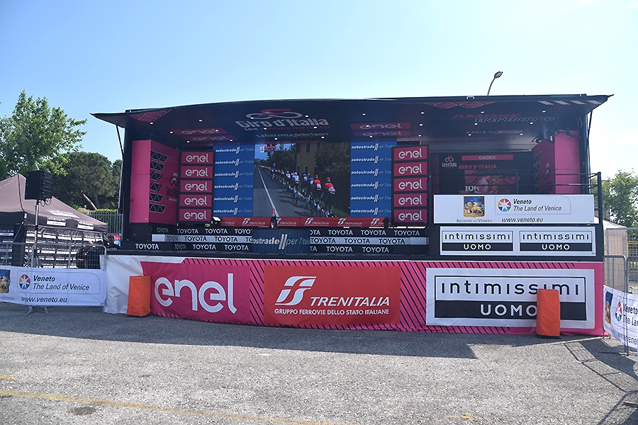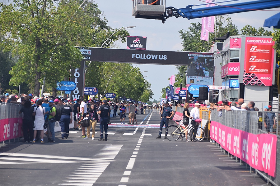Die Bar „La Vela Sunrise“ gegenüber sorgt mit bekannten Italo-Hits wie „Gente di Mare“ von Umberto Tozzi und Raf oder „Un’estate italiana“ von Gianna Nannini und Edoardo Bennato für ein Urlaubsgefühl. Wie immer zeigen die ersten offiziellen Begleitfahrzeuge die unmittelbar bevorstehende Ankunft des Giro d’Italia an. Und als die Helikopter kreisen, dauert es nur wenige Augenblicke bis das dieses Mal geschlossene Hauptfeld vorbei rauscht.
