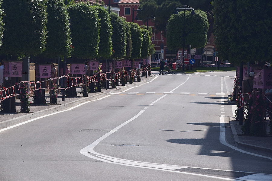 Der Blick auf die lange Zielgerade und das Zielgelände in der Strada Traghete lässt die Anspannung bei den Verantwortlichen spüren, die die gesamte Organisation mit sich bringt. Fans queren die Straße, die Teambusse trudeln ein, das ist ein Durcheinander, das unter Kontrolle gehalten werden muss. Die letzte Stunde vor der Ankunft der gesamten Giroflotte erleben wir am Lungomare Trieste mit Blick auf das Meer und eines der Wahrzeichen Caorles, die Kirche Madonna dell’Angelo.