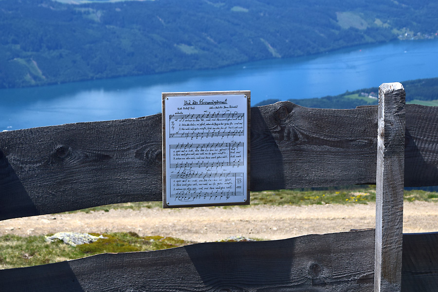 Nächster markanter Orientierungspunkt ist das Obermillstätter Almkreuz auf 2.046 Metern Seehöhe. Es ist von einem Holzzaun umgeben, auf dem Kärntner Liedtexte mit Bergbezug und Tafeln mit Bergsprüchen aufgehängt sind. Eine wunderschöne Idee.