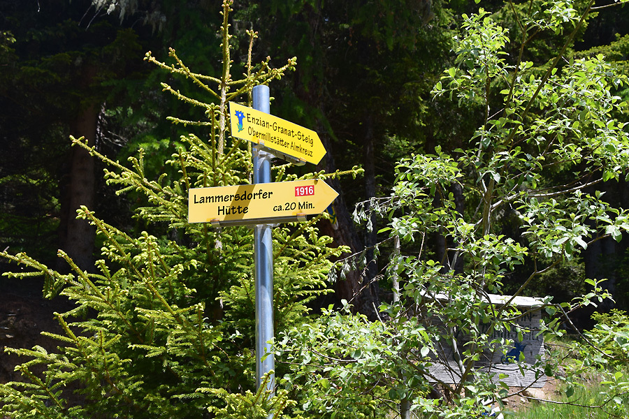 Der ist zwar steiler und geht auf die Knie, aber man ist auch deutlich schneller. Tafeln weisen den Weg zurück zur Lammersdorfer Hütte. Die Baumgrenze ist erreicht und der Millstätter See kommt perspektivisch näher. Konzentration ist gefragt, um sich keinen Fehltritt im Sinne von Umknicken zu leisten.