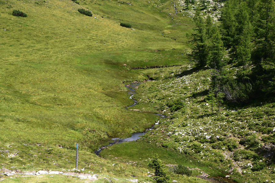Der Pfannnocksee liegt in einer Karmulde, umrahmt vom großen (2.254 Meter) und kleinen Pfannnock (2.200 Meter). Die vielen kleinen schwarzen Lebewesen im Wasser erweisen sich als Kaulquappen, die hier ihre Zeit verbringen, um bald Frösche zu werden. Weiter geht die Runde über einen schmalen Pfad. Immer wieder stehen bleiben, lautet das Motto: Hier gibt es unglaubliche Nah- und Fernblicke. Gratis und in Farbe.